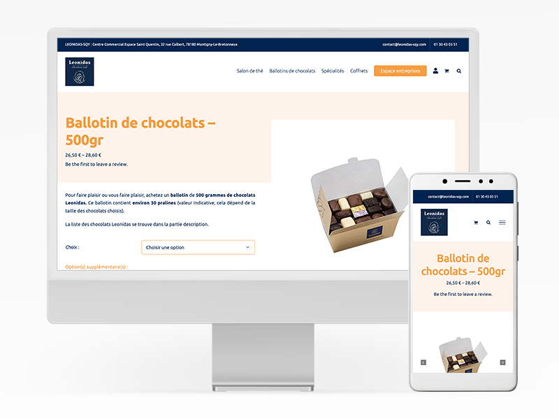 Nous avons conseillé à la franchise Leonidas SQY la solution WEB SHOPPING pour la création de leur site e-commerce. Un site e-commerce sur-mesure qui leur permet de vendre leurs produits en ligne et d’informer les CE d’entreprise d’offres exceptionnelles.